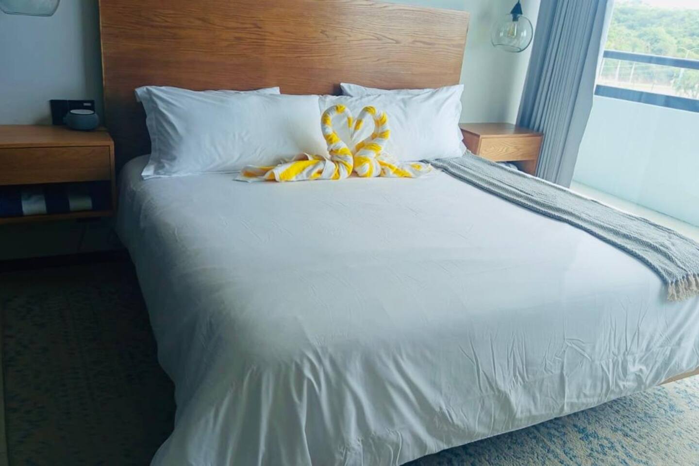 Primary bedroom is 1 King, secondary bedroom has 2 Queens. Both bedrooms have their own balcony with ocean views, automatic light filtering shades + curtains and TV. Send me a message if you have specific questions on pricing or the property.